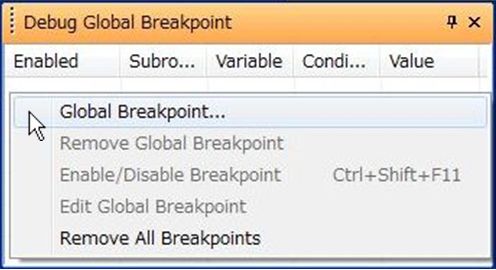 グローバル・ブレークポイント・ウィンドウ( Global Breakpoints Window )はプログラムが動作中、ユーザが設定した行で停止出来るようにします。 グローバル・ブレークポイント・ウィンドウは、Enabled(可能可否)、Subroutine(サブルーチン)、Variable(変数)、Enabled(可能可否)、Condition(条件)、Value(値)をモニターします。 ウィンドウ上にマウスを移動後右クリックしポップアップ・メニューで Grobal Breakpoint... を選択すると Set Grobal Breakpoint ダイアログ・ボックスが表示されますのでパラメータをセットし<OK>ボタンをクリックすると設定されます。 この操作はデバッグ・ツール・バーの Global Breakボタンをクリックするか、メニュー・バーのDebug|Global Breakpoint...からもできます。 グローバル・ブレークポイント・ウィンドウ( Debug Gloval Breakpoint )上に移動、右クリックでコンテキスト・ポップアップ・メニューから Enabled(動作可能にする)/ Disabled(動作不可にする)の操作が個々に出来ます。 マウスでブレークポイントを選択(ハイライト)後、右クリックで Enable-Disable Breakpoint を選択すると現在の状態が切り替わります。 グローバル・ブレークポイントを外すには、対象のブレークポイントを選択(ハイライト)し、マウス右ボタンをクリック後 Remove Global Breakpoint を選択します。 全てのグローバル・ブレークポイントを全て外すには、Remove All Global Breakpoints を選択します。 | ||||||||||||||||||||
